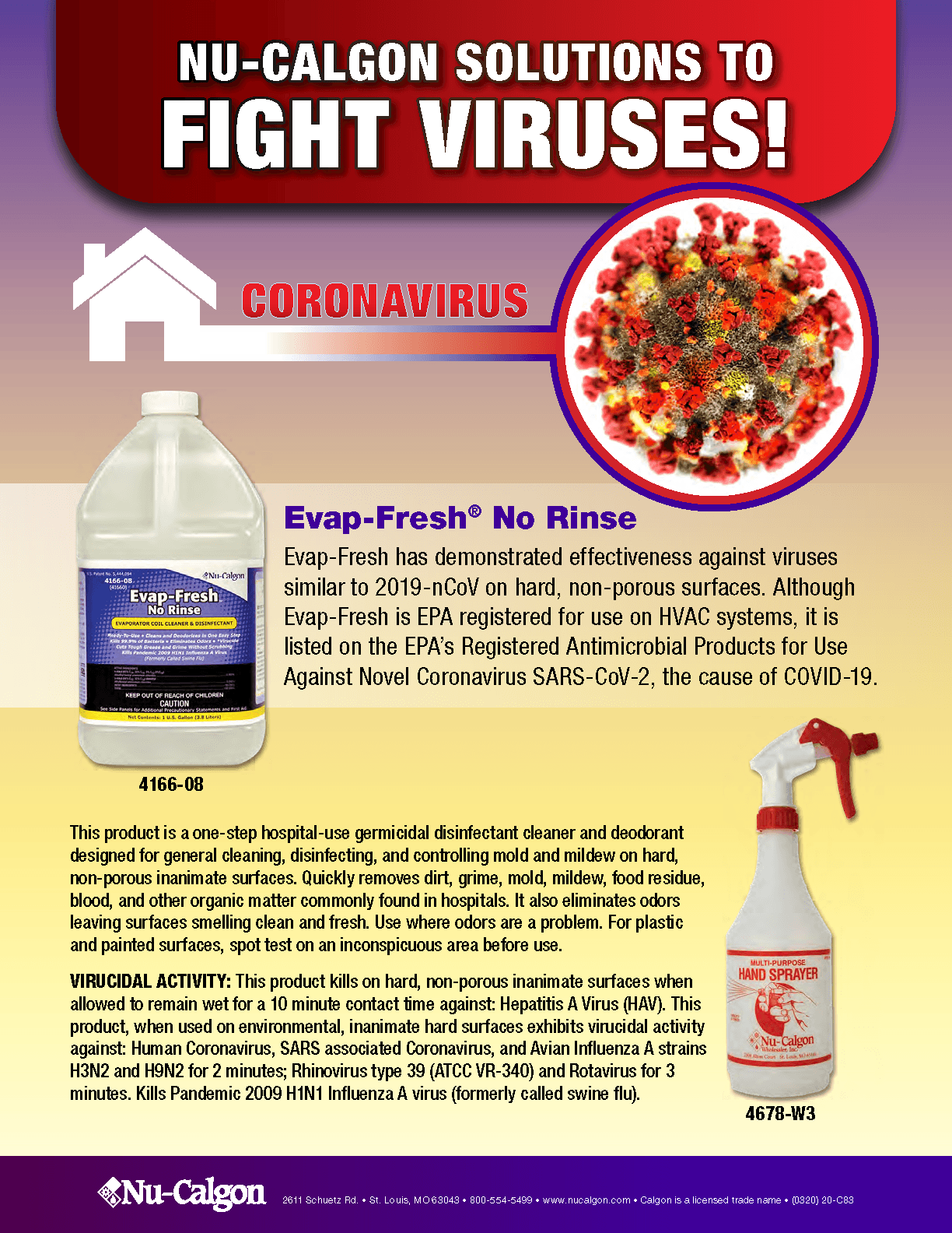 We use Nu-Calgon's Evap-Fresh which has demonstrated effectiveness against viruses similar to 2019-nCoV on hard, non-porous surfaces. Although Evap-Fresh is EPA registered for use on HVAC systems, it is listed on the EPA’s Registered Antimicrobial Products for Use Against Novel Coronavirus SARS-CoV-2, the cause of COVID-19.