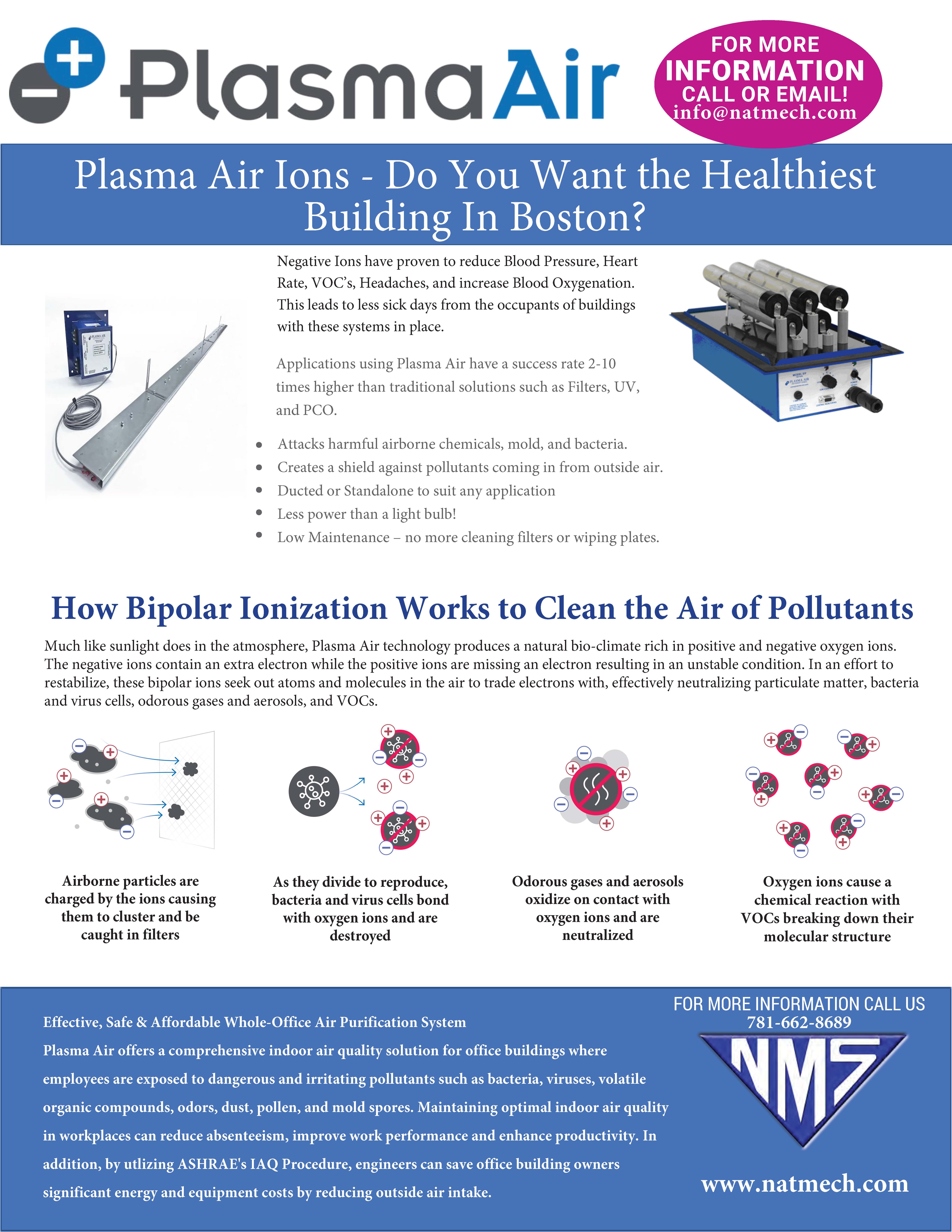 Plasma Air offers a comprehensive indoor air quality solution for office buildings where employees are exposed to dangerous and irritating pollutants such as bacteria, viruses, volatile organic compounds, odors, dust, pollen, and mold spores. Maintaining optimal indoor air quality in workplaces can reduce absenteeism, improve work performance and enhance productivity. In addition, by utlizing ASHRAE's IAQ Procedure, engineers can save office building owners significant energy and equipment costs by reducing outside air intake.